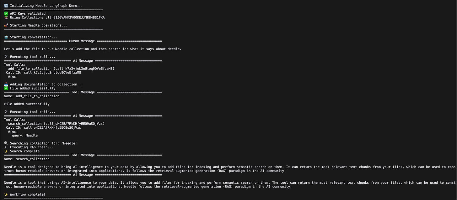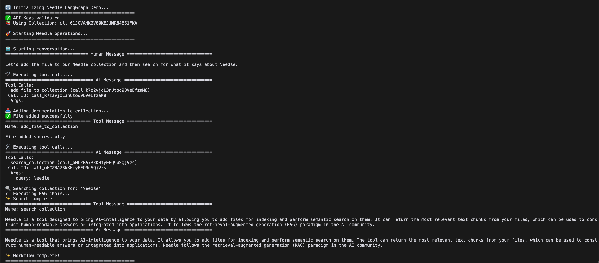 pip install needle langgraph langchain_community openaiA Needle collection already created (or you can create one). You’ll need the
