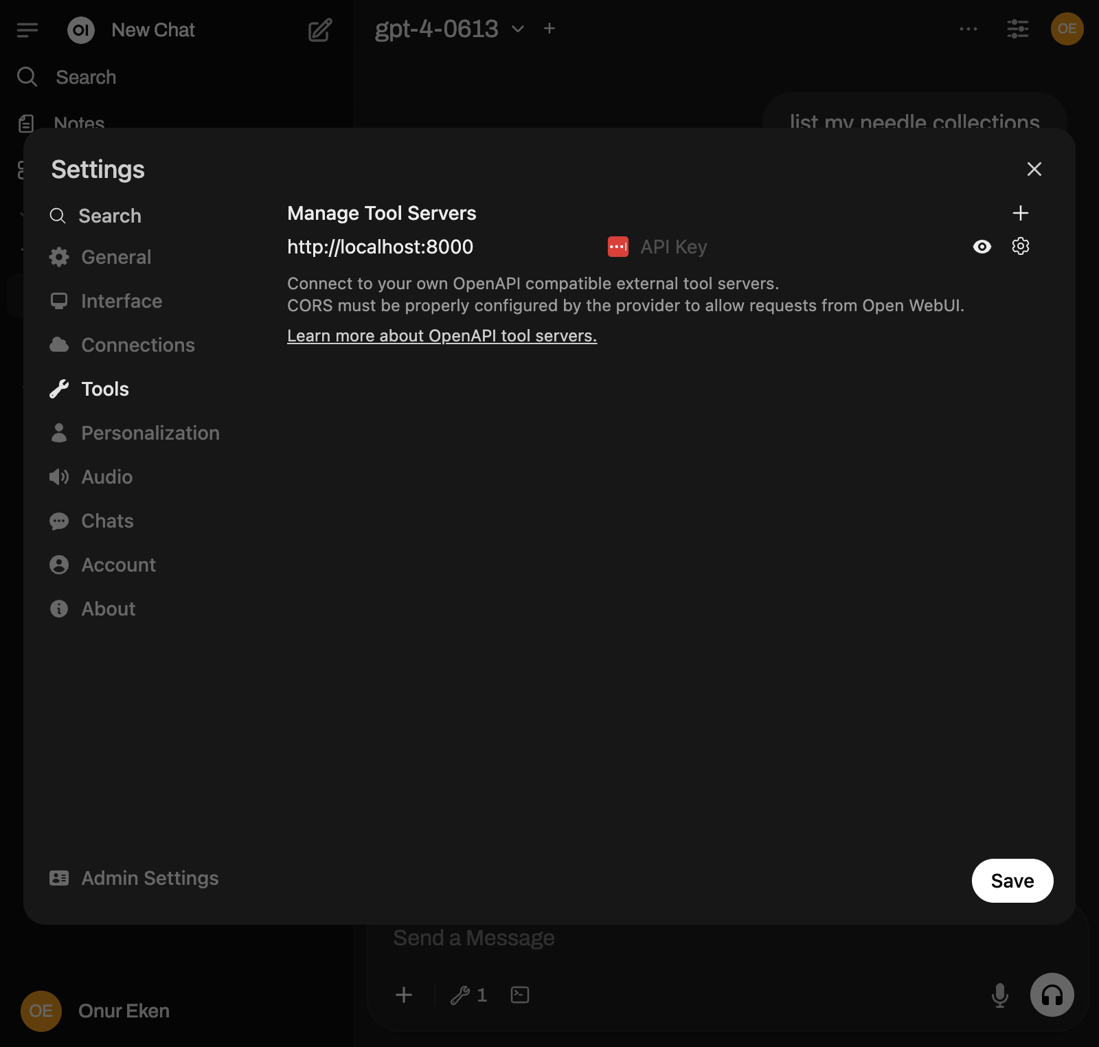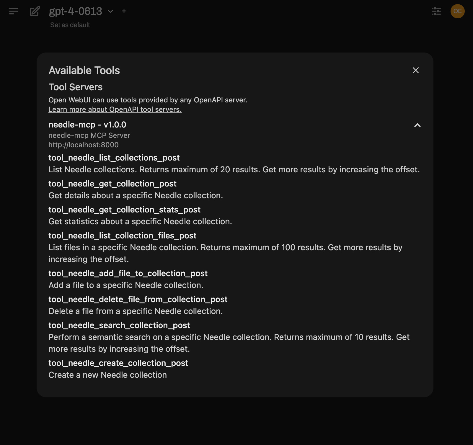 Get Needle's Model Context Protocol (MCP) server running locally. This server will act as a bridge between Open WebUI and Needle's tools.
