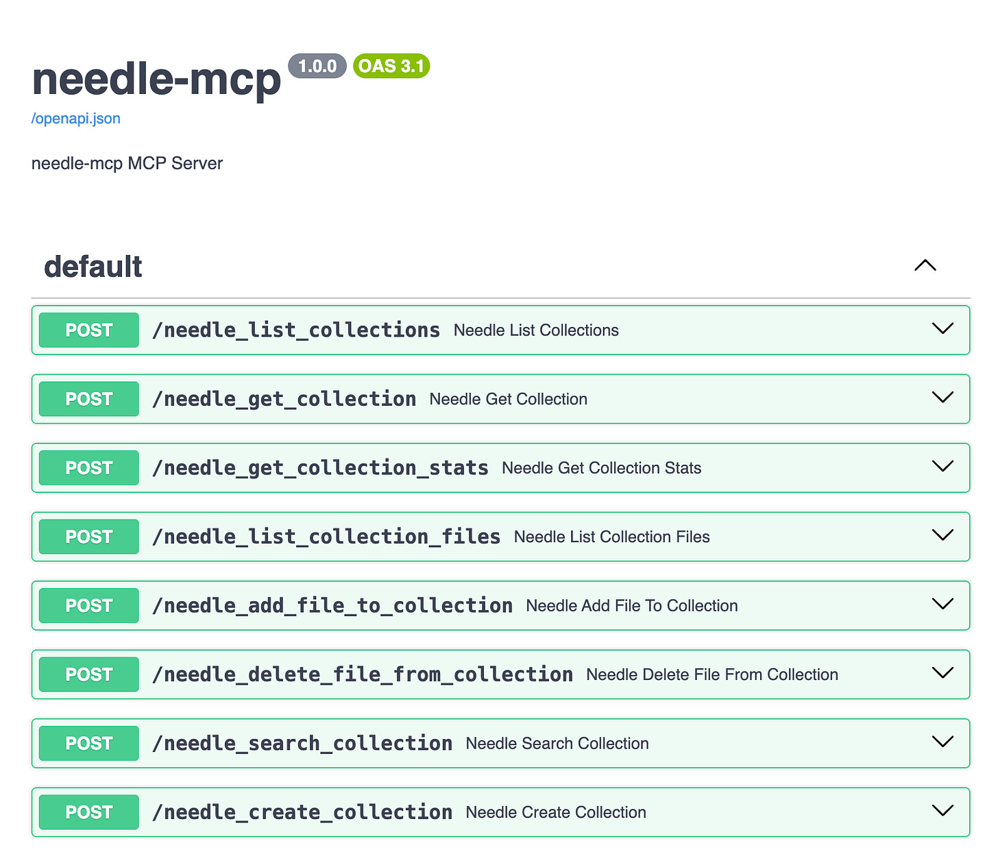 Perfect! You should see the Needle tools documentation page like below. This confirms that the MCP server is running and can communicate with Needle's services.