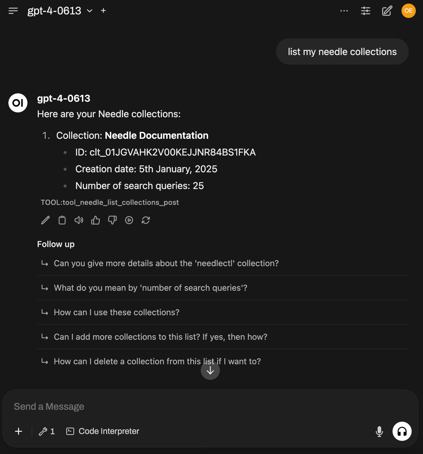 Let's test it with a simple command. In the chat, type: List my Needle collections.