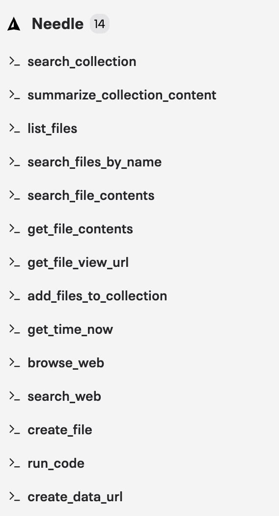 The toolset in Needle isn’t static. As you add new connectors or as we ship improvements like summarize_collection_content