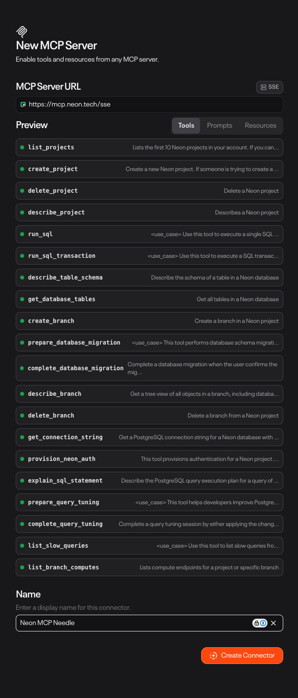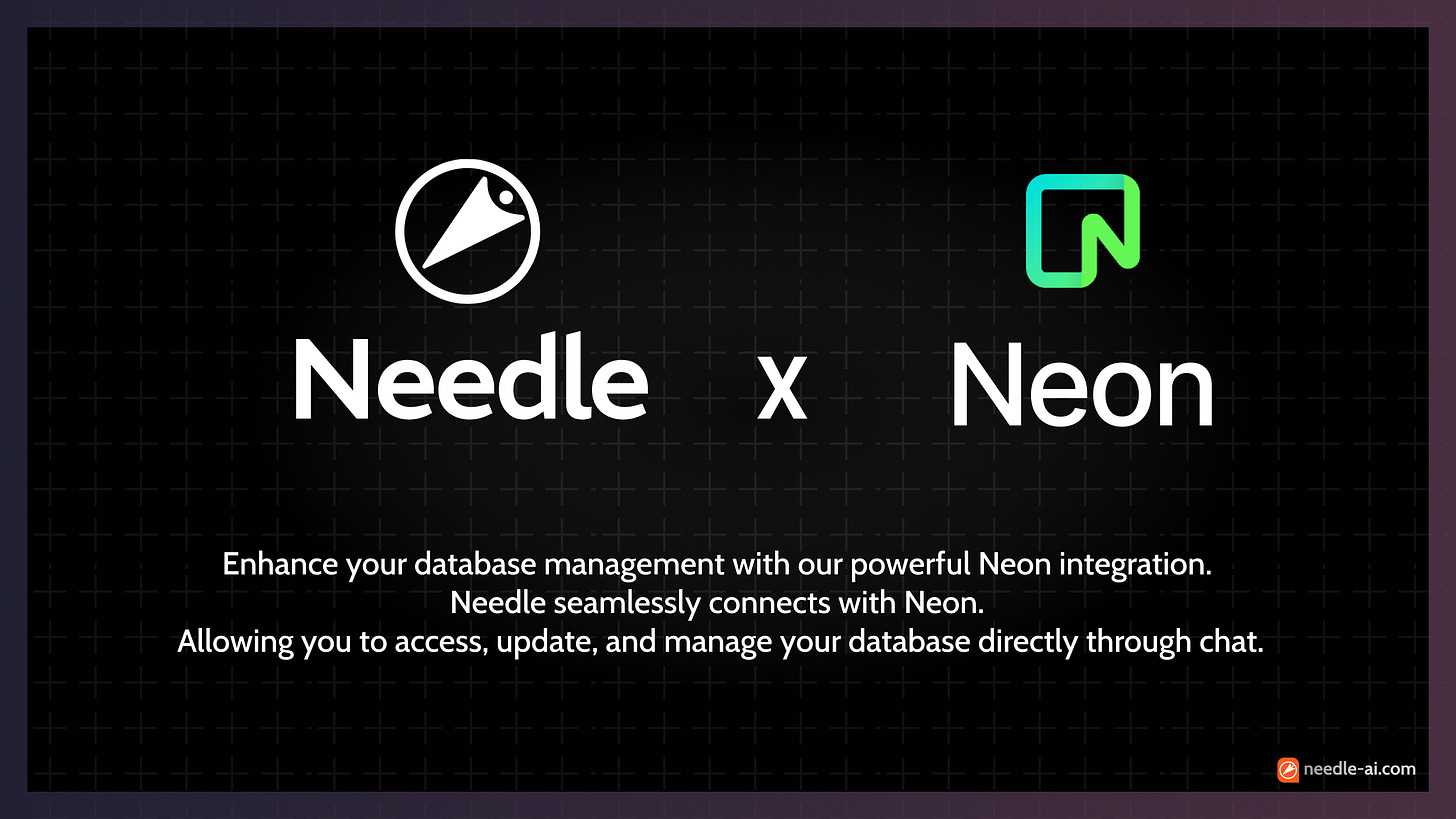 Solution: Needle + Neon Integration The integration provides a unified chat interface for comprehensive database management, enabling teams to execute SQL queries, manage database branches, and handle migrations through natural language commands.