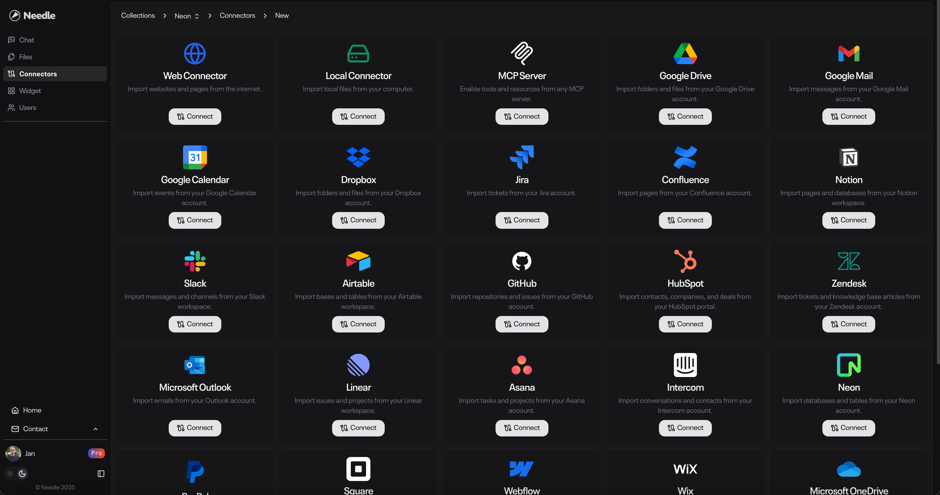 Got to Collection - Connectors - Create Connector: https://needle-ai.com
