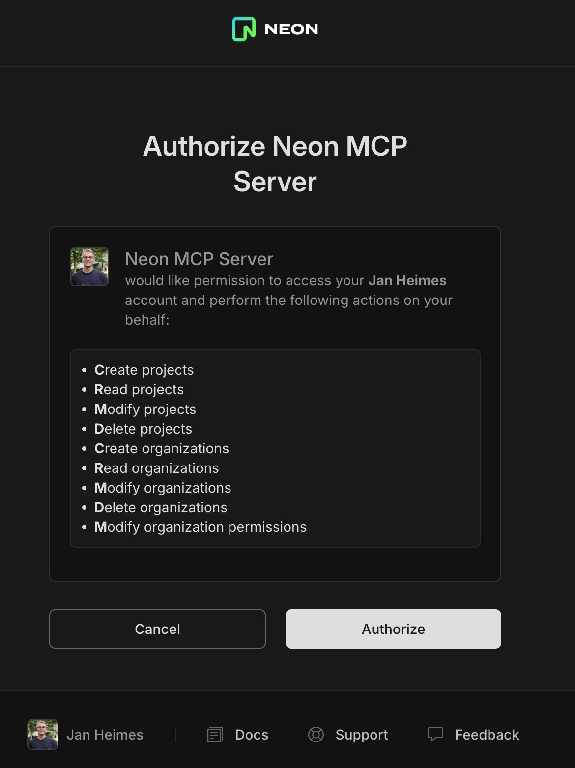 Authorize Access: Click "Authorize" to grant Needle secure access to your Neon account