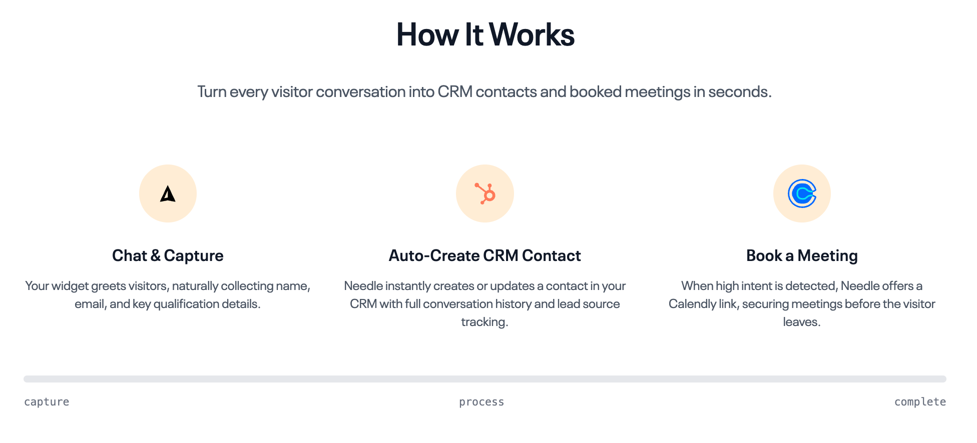 When Needle detects high intent or gathers enough qualification information, it can smoothly transition to booking a call or connecting them with your team. With 8+ CRM integrations, all that conversation context flows directly into your sales system.